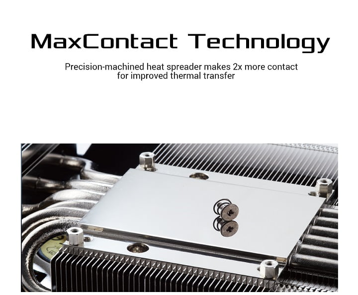 اگر به یاد داشته باشید ایسوس در نسل قبلی کارت گرافیک های خود، فناوری MaxContact را معرفی کرده بود که این فناوری در سری جدید محصولات نیز وجود دارد. با استفاده از فناوری MaxContact، ایسوس قسمت ارتباطی تراشه گرافیکی به هیت سینک را بیش از 10 برابر صاف تر کرده و این سطح صیقلی چسبندگی 2 برابر بهتری را نسبت به رقبا ایجاد می کند. این امر منجر به دفع بهتر دما می گردد.