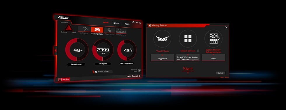 خنک سازی کل سیستم همیشه برای ایسوس اهمیت دارد. فناوری FanConnect  که در نسل قبلی معرفی شده بود در این نسل نیز بهبود یافته و به وسیله FanConnect II می توانید مدیریت فن های کیس را به کارت گرافیک سپرده و میزان چرخش و جریان هوای درون کیس را کنترل نمایید. ایسوس برای بهینه سازی و اورکلاکینگ کارت گرافیک نیز نرم افزار خوشنام GPU Tweak II را برای نسل جدید بهینه کرده و به سادگی می توانید تمامی تنظیمات مورد نیاز برای اورکلاکینگ پایدار در این نرم افزار تغییر دهید. همچنین برای گیمر ها نیز پروفایلهای از پیش تعریف شده ای وجود دارد که برای استفاده از آن فقط به یک کلیک نیاز است. در کنار این ویژگی ها GPU Tweak II می تواند توسط ویژگی GameBooster نیز منابع سیستم را برای گیمینگ آزاد کند.