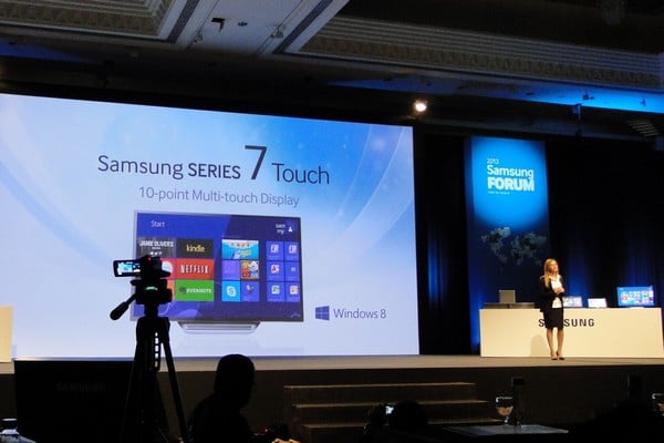بعد از این مرحله خانم Haddad نوت بوک های سری 9 و همچنین محصولات جدید این شرکت را که به نام ATIV Smart PC معرفی کرد که مجهز به سیستم عامل ویندوز هشت است و کاربر قادر است این دستگاه را در دو حالت تبلت و نوت بوک (همراه با صفحه کلید) استفاده کند. این محصولات با پردازنده Core i5 و Core i7 ارائه می شود و کارایی بسیار بالایی دارد. همچنین برای تجربه بهتر سامسونگ در بعضی از سری‌ها از قلم استفاده کرده است. نوت بوک های سری 9 این شرکت دارای 20.9 میلی متر ضخامت است و دارای نور پس زمینه صفحه کلید و یازده ساعت عمر باتری است. سری دیگر نوت بوک های سامسونگ طبق ادعای این شرکت 17 میلی متر ضخامت و دارای صفحه نمایش Full HD‌ است. محصول دیگر این شرکت یک صفحه نمایش (در اصل یک All in one کوچک) بود که از سیستم عامل ویندوز هشت بهره می برد. این محصول امکان تغییر زاویه 60 درجه را داشته و از قابلیت لمس ده انگشتی پشتیبانی میکند. این محصول از کارایی و امکانات خوبی برخوردار است و طراحی آن جلوه خاصی به میز کار شما می‌دهد (البته تصویر بالا مربوط به مدل های سری 7 است که در سالن کنار محل برگزاری سمینار قرار گرفته بودند). در ادامه می توانید تصاویری از نمایشگاه محصولات معرفی شده در این سمینار را مشاهده کنید.