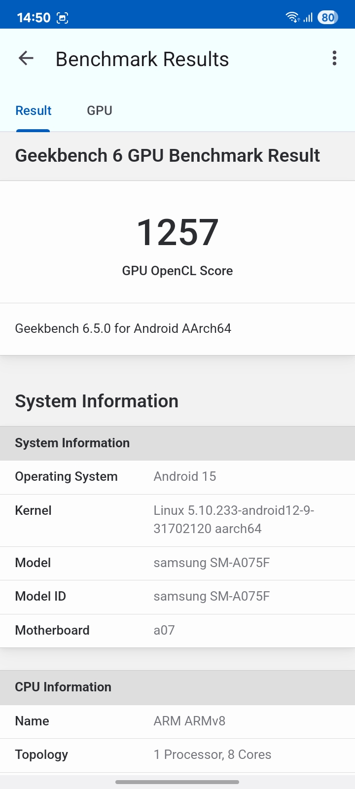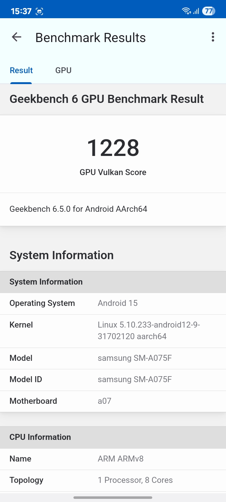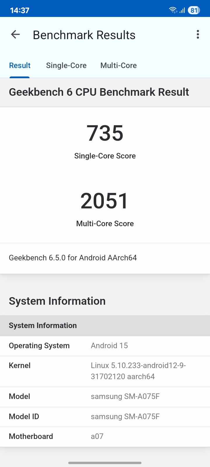 نتایج تست های بنچمارک گوشی گلکسی ای ۰۷ سامسونگ