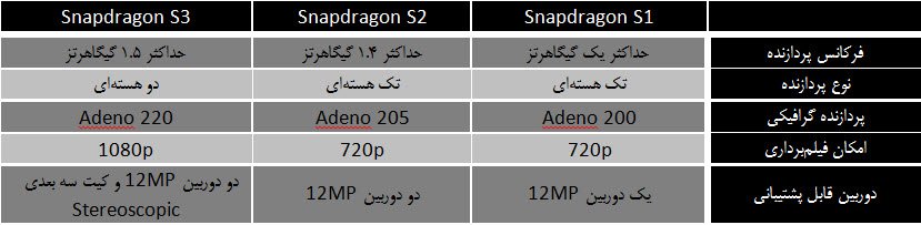 اگر اهل موبایل و تجهیزات همراه باشید به طور حتم نام پردازنده Snapdragon شرکت Qualcomm به گوشتان خورده است. این پردازندههای جمع و جور که در دل اکثر موبایلهای امروزی جای خوش کرده است در سه سری مختلف تولید میشوند که قرار است تا مدتی دیگر سری چهارم آن هم وارد بازار شود. Qualcomm برای شناخت راحتتر این پردازندهها از عبارت S همراه با یک عدد استفاده کرده است به عنوان مثال سری اول این پردازندهها به نام Snapdragon S1 و سری سوم S3 نامگذاری شده است. خوب شاید این سئوال بوجود آید که این مدلها چه فرقی با یکدیگر دارد؟! برای فهمیدن این جواب کافی است به جدول زیر نگاهی بیاندازید تا تفاوت اصلی این سه پردازنده را بهتر متوجه شوید.