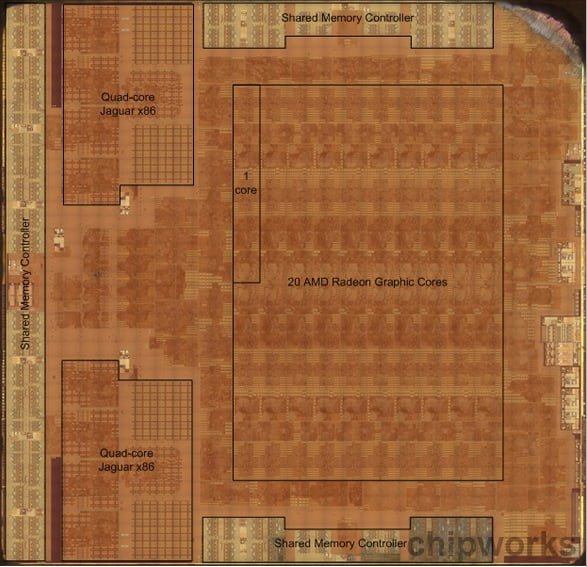 Chipworks که یک کمپانی تحلیلگر ساختار چیپ ست ها و پردازنده ها است، با باز کردن هر دو کنسول و قرار دادن SoC آنها زیر میکروسکوپ، به ما نشان داده که SoC کنسول XBOX One با ابعاد 363 میلیمتر مربع بزرگتر از چیپ ست کنسول PS4 با ابعاد 348 میلیمتر مربع است. هر دو چیپ ست دارای دو ماژول پردازنده چهار هسته ای با معماری Jaguar هستند که طبق تصاویر تا حدودی مشابه یکدیگر به نظر می رسند. مسئله دیگری که به وضوح دیده میشود، تفاوت های بخش پردازش گرافیکی است. XBOX One دارای 14 واحد پردازش است که هر یک از آنها 64 واحد پردازش جریانی در اختیار دارد. در مقابل PS4 از 20 واحد پردازش گرافیکی بهره میبرد که هر یک 64 واحد پردازش جریانی دارند. هر دو پردازنده گرافیکی از معماری GCN بهره می برند و در هر دو مدل، دو عدد از واحد های اجرایی غیرفعال هستند.