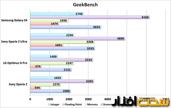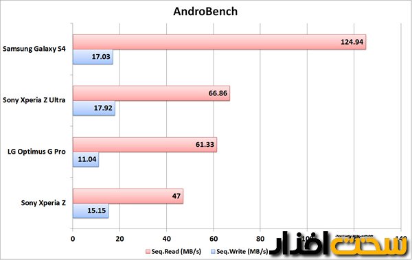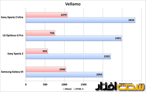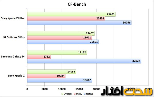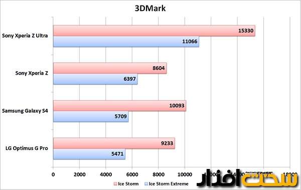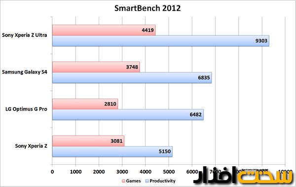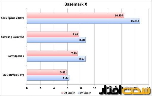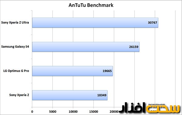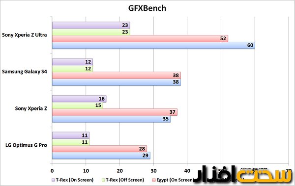 طبق معمول همیشه، پیش از انجام تست ها باتری گوشی را به طور کامل شارژ کرده و تمامی Widget ها را از روی صفحه برداشتیم. همچنین سیستم صرفه جویی در توان مصرفی گوشی نیز خاموش است و در مدت زمان تست گوشی به شارژر متصل است. عملکرد اکسپریا زد اولترا در تست ها واقعاً عالی است و البته به غیر از این هم انتظار نمیرود. چیپست قدرتمند به همراه پردازنده گرافیکی قوی میتواند امتیاز های بسیار خوبی را به ثبت برساند و این گوشی را در جایگاه اول تست ها قرار دهد. همچنین از آنجا که این فبلت میخواهد با رقبا (هم گوشی هوشمند و هم فبلت های دیگر) نیز مبارزه کند، نتیجه تست برخی رقبای آن (که ویژگی مشترک همه آنها صفحه نمایش Full HD است) را نیز در نمودار نتایج ذکر کردیم (تست های Xperia Z و Galaxy S4 دوباره و با آخرین نسخه از بروزرسانیهای سازنده و نرم افزارها انجام شدند). در ضمن این نمودار میتواند ارزیابی خوبی از پلتفرمها و چیپستهای مختلف به شما بدهد.
