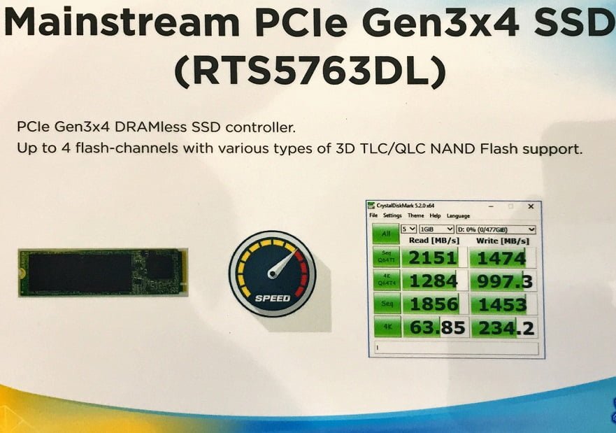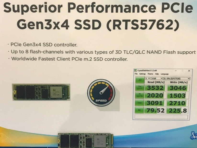 کنترلر RTS5762 از 8 کانال حافظه در معماری های TLC و معماری های آتی یعنی QLC حمایت کند. این کنترلر با تکیه بر مسیر PCIe 3.0 x4، می توان سرعت خواندن و نوشتن حداکثر 3500 و 3000 مگابایت در ثانیه را به نمایش بگذارد. کنترلر RTS5763DL نیز با پروتکل NVMe 1.3 SSD، مسیر PCI 3.0 x4 و عملکردی کمی کمتر از برادر خود، دارای سرعت های 2150 مگابایت برای خواندن و 1475 مگابایت در ثانیه برای نوشتن را به همراه دارد. برای مقایسه بهتر، بد نیست بدانید که عموما حداکثر سرعت SSDهای SATA III به 560 مگابایت در ثانیه می رسد.