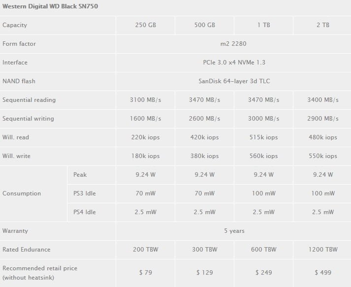 سالید های Western Digital WD Black SN750 در ظرفیت های 256 گیگابایت الی 2 ترابایت تولید می شوند. یکی از ویژگی های آنها، استفاده از یک خنک کننده فلزی (هیت سینک) به رنگ مشکی است که این خنک کننده تولید و طراحی شده توسط شرکت EK است. این محصولات از مسیر پر سرعت PCIe 3.0 x4 NVMe بهره برده و در تولید آنها از تراشه های نیمه هادی SanDisk 64-layer 3d TLC استفاده شده است. در ادامه می توانید مشخصات فنی، قیمت و دیگر مشخصات این خانواده را در جدول زیر مطالعه نمایید.
