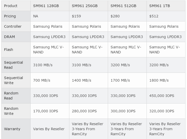 این خانواده در حجم های 128 گیگابایت الی 1 ترابایت تولید خواهند شد.نوع تراشه های مورد استفاده در آنها نیز MLC V-NAND است.علاوه بر کنترل حرارت به لطف قطعات جدید،سامسونگ موفق به تثبیت قیمت شده است.مدل 1TB SM961 تنها با قیمت 512 دلار عرضه می گردد.در جدول مشخصات می توانید تمامی اطلاعات را مطالعه نمائید.