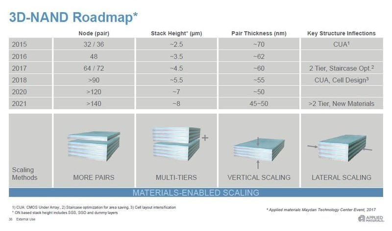 در حال حاضر، حافظه های SSD با تراشه هایی تولید می شوند که به حداکثر 64 لایه مجهز است. ترانزیستورهای انباشته شده در حال حاضر با لیتوگرافی 55 نانومتری تولید می شوند. نقشه های راه جدید (Roadmap) نشان می دهد که تا سال 2021، شرکت ها موفق به تولید NAND هایی خواهند شد که دارای 140 لایه است! سپس لیتوگرافی تولید آنها به 45 نانومتر کاهش پیدا خواهد کرد.