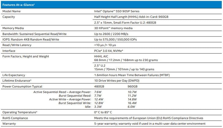 و اما در بخش سرعت، شاهد ارائه سرعت خواندن و نوشتن به ترتیب 2600 و 2200 مگابایت در ثانیه هستیم. همچنین سرعت عمل آنها در آزمون 4K نیز 575K IOPS و 550K IOPS ذکر شده است. خانواده 905P به مراتب سریع تر از گروه 900P بوده و جالب است بدانید که زمان تاخیر آنها نیز تنها 10 میکروثانیه است! طول عمر سالید های Intel Optane 905P نیز 10 DWPD یا 10 درایو در روز است که به واقع رقم بالایی محسوب می گردد.