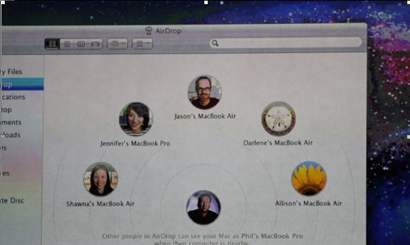 4- Air Drop نوع جدیدی از سرويس به اشتراکگذاری فایلها در شبکههای Wi-Fi است. در محیط این نرمافزار میتوانید کامپیوتر خود و دیگر افراد حاضر که Airdrop را فعال کردهاند مشاهده کرده و به سادگی فایل دلخواهتان را روی شمایل کامپیوتر مقصد بکشید و آن را انتقال دهید.