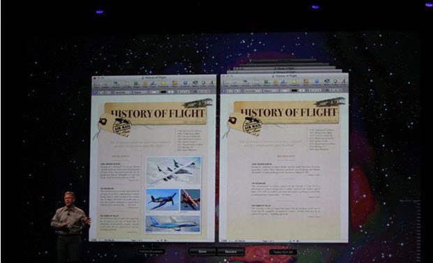 2- برنامهها بصورت تمام صفحهنمایش خواهند یافت. تا قبل از سیستم عامل Lion بسیاری از نرمافزارها در Mac توانایی باز شدن بصورت تمام صفحه را نداشتند! از این پس این ویژگی نیز در اختیار شما قرار گرفته است و شما میتوانید با حرکت دادن انگشتانتان روی صفحه لمسی در بین صفحات برنامههای باز حرکت کنید.