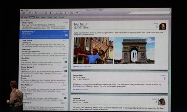 2- Mail: از سرویسهایی که به خوبی در Lion پیشرفت کرده سرویس میل است به لحاظ ظاهری این نسخه از صفحهبندی ستونی بهره برده است (چیزی شبیه به سرویس میل iPad) – همچنین اینکه در اینجا نیز نامههایی که در جواب یکدیگر ارسال و دریافت شدهاند به صورت پرسش و پاسخ نمایش داده میشوند. ولی نقطه قوت سرویس جدید در هوشمند شدن Search است که توجه بسیاری از حضار را نیز به خود جلب کرد.