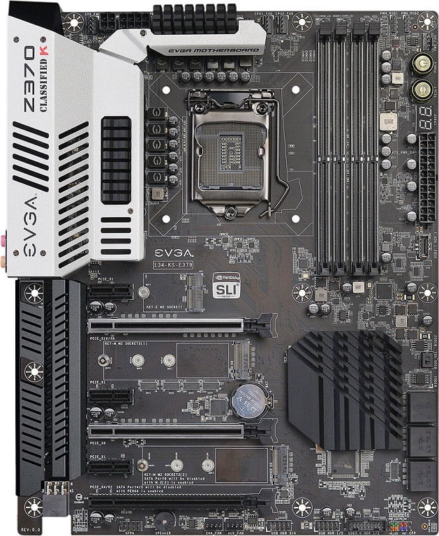 نخست، مادربرد پرچمدار EVGA Z370 Classified K را داریم؛ این محصول با 4 اسلات رم DDR4 می تواند از 64 گیگابایت رم با فرکانس 4133 مگاهرتز پشتیبانی نماید. این مادربرد از آرایش SLI دو عددی پیشتیبانی کرده و به خروجی های گرافیکی آنبرد HDMI 2.0 و DisplayPort 1.2 مجهز شده است. EVGA Z370 Classified K دارای 6 رابط SATA III و دو اسلات SSD M.2 است. یک اسلات اضافی SSD M.2 گونه 32 میلی متری نیز برای آن در نظر گرفته شده است. این مادربرد دارای دو تراشه Killer Gigabit به همراه فناوری Killer DoubleShot Pro است. این برد به 6 هدر قابل برنامه ریزی PWM مجهز گشته و کلیدهای فیزیکی اورکلاک و فرمان های اضطراری هستند. یک مدار تغذیه 13 فاز رگولاتور، سیستم صوتی Creative Sound Core3D 5.1 Channel HD و به همراه افزایش قابلیت های اورکلاک در بایوس، از جمله دیگر ویژگی های این پرچمدار آمریکایی است.