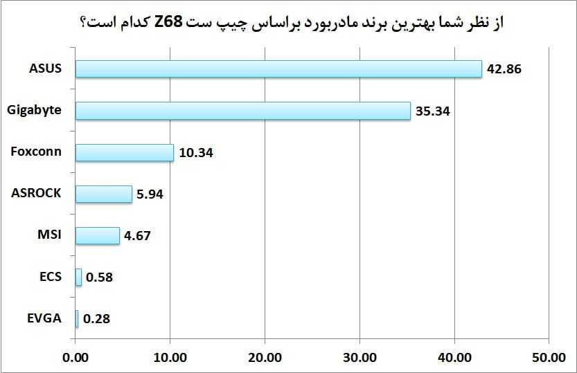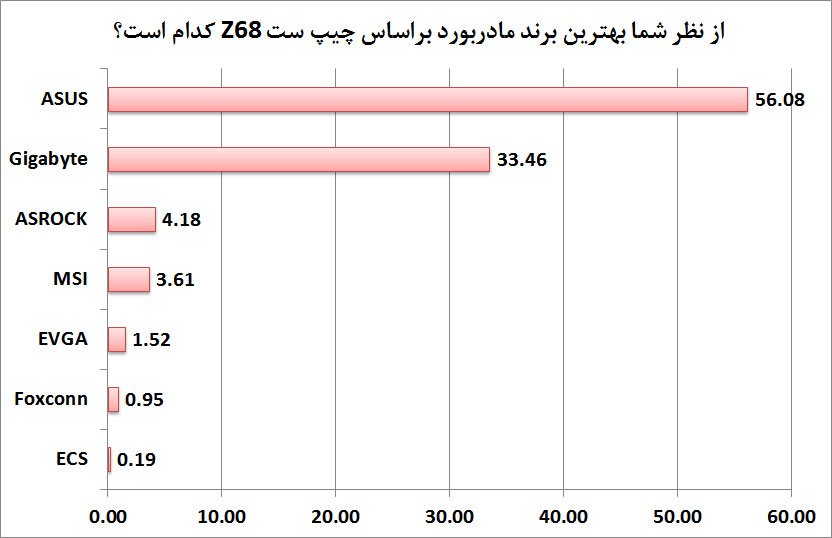 با در نظرگرفتن نتايج بدست امده از نظرسنجي، بهترين برند مادربورد Z68 از ديد کاربران مادربوردهاي شرکت ASUS شناخته شده است و به همين علت از طرف وبسايت و نشريه سختافزار نشان برتر انتخاب توسط کاربران به اين شرکت اعطاء ميگردد.