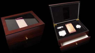 آیفون 6s، طلا، کریستال و پوست کروکودیل در جعبه ای از چوب گیلاس