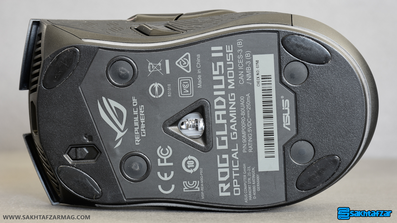 در زیر ماوس می توان مواردی همچون نام محصول، شناسنامه محصول، پایه های پلاستیک برای ثبات ماوس بروی سطوح صاف، سنسور اپتیکال و قفل پورت Micro USB را مشاهده کرد.