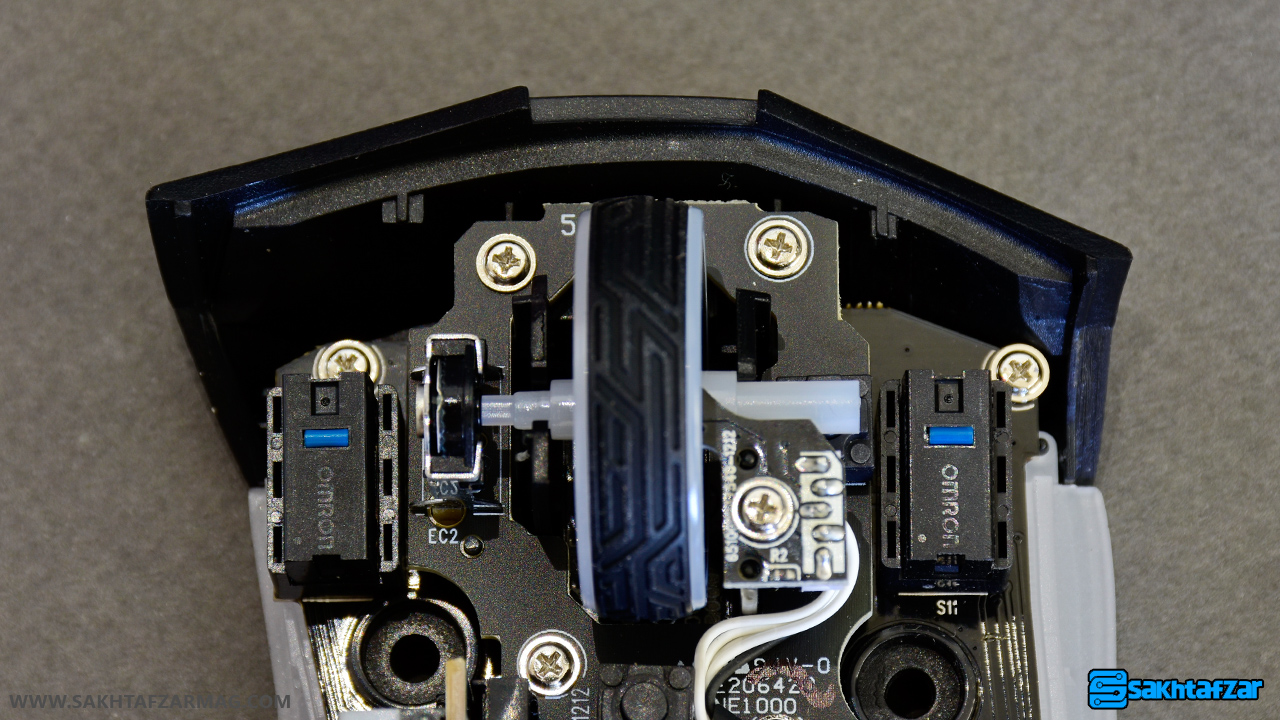 در زیر ماوس 4 قطعه پلاستیکی گرد قرار گرفته است که با برداشتن آنها می توانید به 4 پیچ دسترسی داشته باشید. با باز کردن پیچ ها قاب روی ماوس برداشته می شود و می توان به سویچ های کلیک و اجزاء داخلی دسترسی داشت. یکی از ویژگی های بارز گلادیوس 2 وجود 2 سویچ دیگر در جعبه این ماوس است. هر کدام از سویچ های ژاپنی OLRON می تواند تا 50 میلیون کلیک طول عمر داشته باشد. چنانچه بعد از مدتها کار کردن با ماوس احساس کردید کلیک کردن با دقت بالایی انجام نمی شود می توان با قرار دادن سویچ های موجود این مشکل را برطرف کرد.