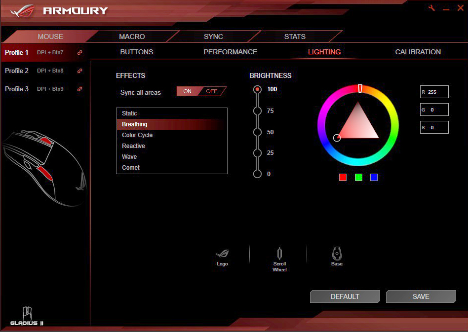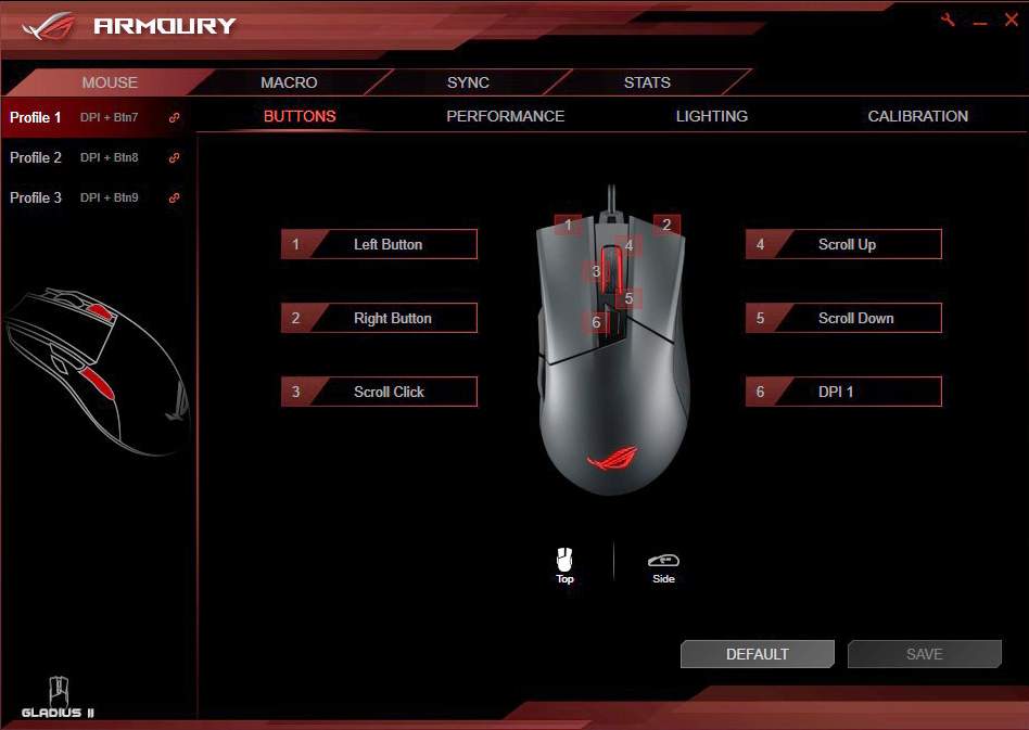 بعد از تهیه این ماوس به وب سایت ایسوس مراجعه کرده و نرم افزار اختصاصی موجود را برای این محصول دانلود کنید. نرم افزار ROG ARMOURY نرم افزاری است کامل که دسترسی گسترده ای را برای کاربر به وجود می آورد. این نرم افزار قابلیت این را دارد تا 3 پروفایل را برای کاربر در نظر بگیرد و کاربر هم می تواند در هر کدام از پروفایل ها شخصی سازی هایی همچون نورپردازی، تغییر دستور کلید ها و حساسیت DPI را تغییر دهد.