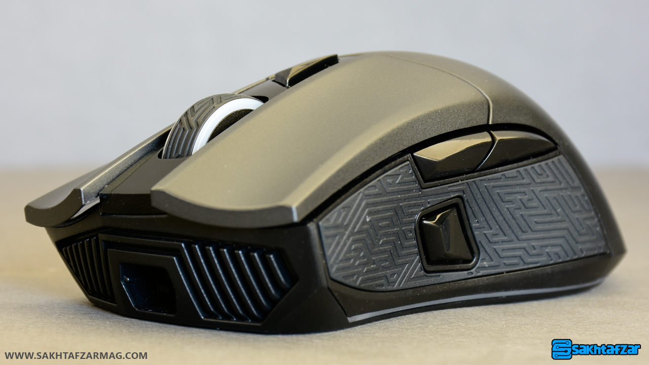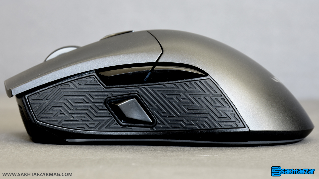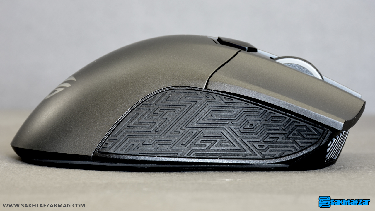 قوس کمر ماوس برای قرار گیری کف دست مناسب است و با ساختاری که دارد می تواند دست کاربر را کاملاً پوشش دهد. البته سطح این بخش از ماوس استحکاک کمی را ایجاد می کند و ممکن است با خود بگویید که هنگام جابجا کردن، ماوس از دست خارج می شود اما ایسوس برای استحکاک و چسبندگی بیشتر، لبه های ماوس را با ساختاری متفاوت در نظر گرفته است. در لبه ها، گلادیوس به پلاستیک نرم و نقش داری مجهز شده است که باعث جابجایی بهتر محصول می شود.