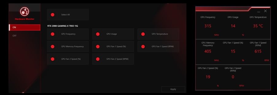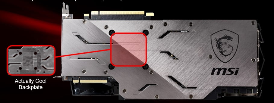 در سری GAMING X TRIO حتی فن ها نیز به صورت مجزا و در 2 دسته، بر اساس دمای ایجاد شده فعال خواهند بود. به عنوان مثال، فن جلویی در صورت رسیدن به دمای 60 و دیگر فن ها با رسیدن به دمای 56 درجه سانتی گراد شروع به چرخش خواهند کرد. (کارت گرافیک RTX 2080). بسیاری از کارت گرافیک های با این ابعاد، دارای پوشش Backplate به منظور حفاظت از خم شدن PCB هستند؛ اما MSI یک پوشش دیگر را در بخش تراشه ها استفاده کرده است تا از تراشه و قطعات به خوبی حفاظت گردد.