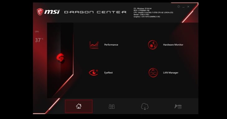 پس از آن، برنامه خاص و جذاب Dragon Center را شاهد هستیم. داشبورد مدیریتی شما با ظاهری زیبا و متین، تمامی پارامترهای مهم و قابل تنظیم را به همراه قابلیت های مانیتورینگ، در اختیار شما قرار می دهد. همچنین پس از فشردن کلید G به وضعیت GAMNIG MODE نقل مکان خواهید کرد. امکان ساخت پروفایل های مجزا و یا استفاده از داده های آماده MSI، مانیتورینگ وضعیت تهویه، فرکانس، ولتاژ و…، امکان اورکلاک فوری با یک کلیک، انتخاب حالت های متنوع برای نویز صوتی فن و هرآنچه که نیاز خواهید داشت، در داشبوردهای مدیریتی این برنامه تزریق شده است.