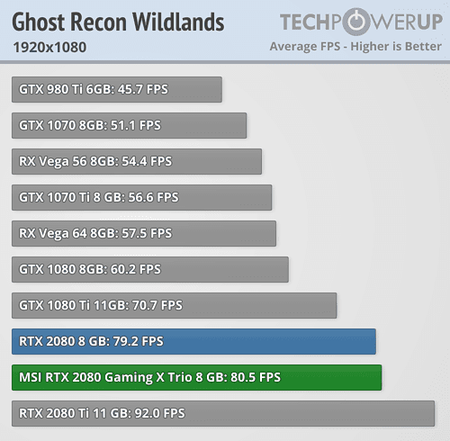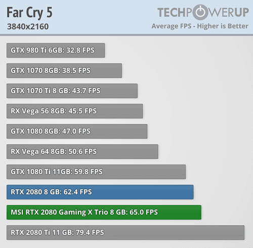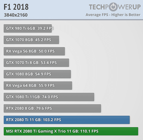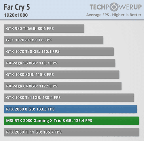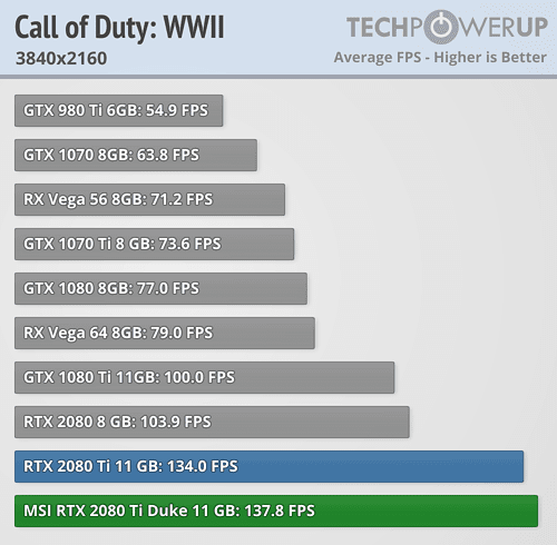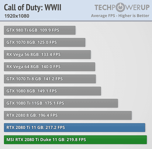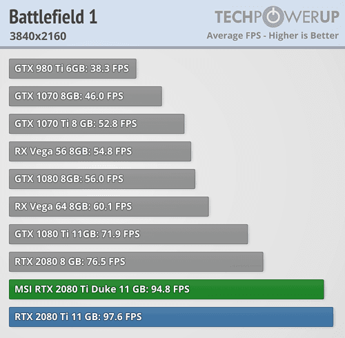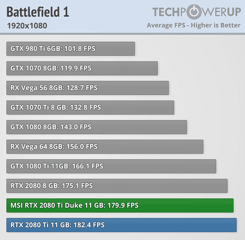 همانطور که می بینید، نتایج به نسبت نسخه رفرنس، هیجان انگیز است! پس ارزش خرید یک کارت گرافیک سفارشی-حرفه ای در نرخ فریم و تهویه به همراه طول عمر و ویژگی های خاص است که برجسته می شود. دومین کارت گرافیک با نام MSI GeForce RTX 2080 Ti Duke، به سیلیکون پرچمدار TU102 مجهز بوده و عنوان سریع و پیشرفته ترین تراشه گرافیکی جهان را یدک می کشد. بد نیست بدانید که MSI این کارت گرافیک را با قیمت 1199 دلار عرضه خواهد کرد؛ دقیقا به قیمت نسخه NVIDIA FE، پس در این صورت خرید مدل های مرجع و FE به هیچ وجه توصیه نمی شود. حال به سراغ چند بنچمارک دیگر خواهیم رفت تا عملکرد “دوک” ام اس آی را بهتر درک نمائید: