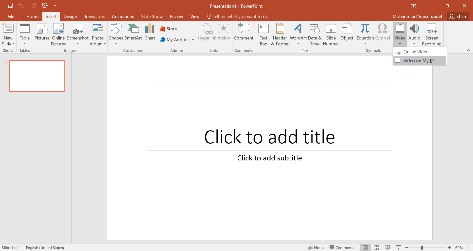 برای این کار فرآیند نسبتا ساده ای را در پیش دارید. معروف ترین فرمت ویدیویی که توسط پاورپوینت پشتیبانی می شود MP4 است و البته تعدادی فرمت مشهور دیگر هم در دسترس شما خواهند بود. برای اضافه کردن ویدیو به یک اسلاید ابتدا روی تب insert کلیک کنید، سپس از آنجا بخش ویدیو را پیدا کرده و از لیستی که نمایش داده می شود videos on my PC را انتخاب کنید.