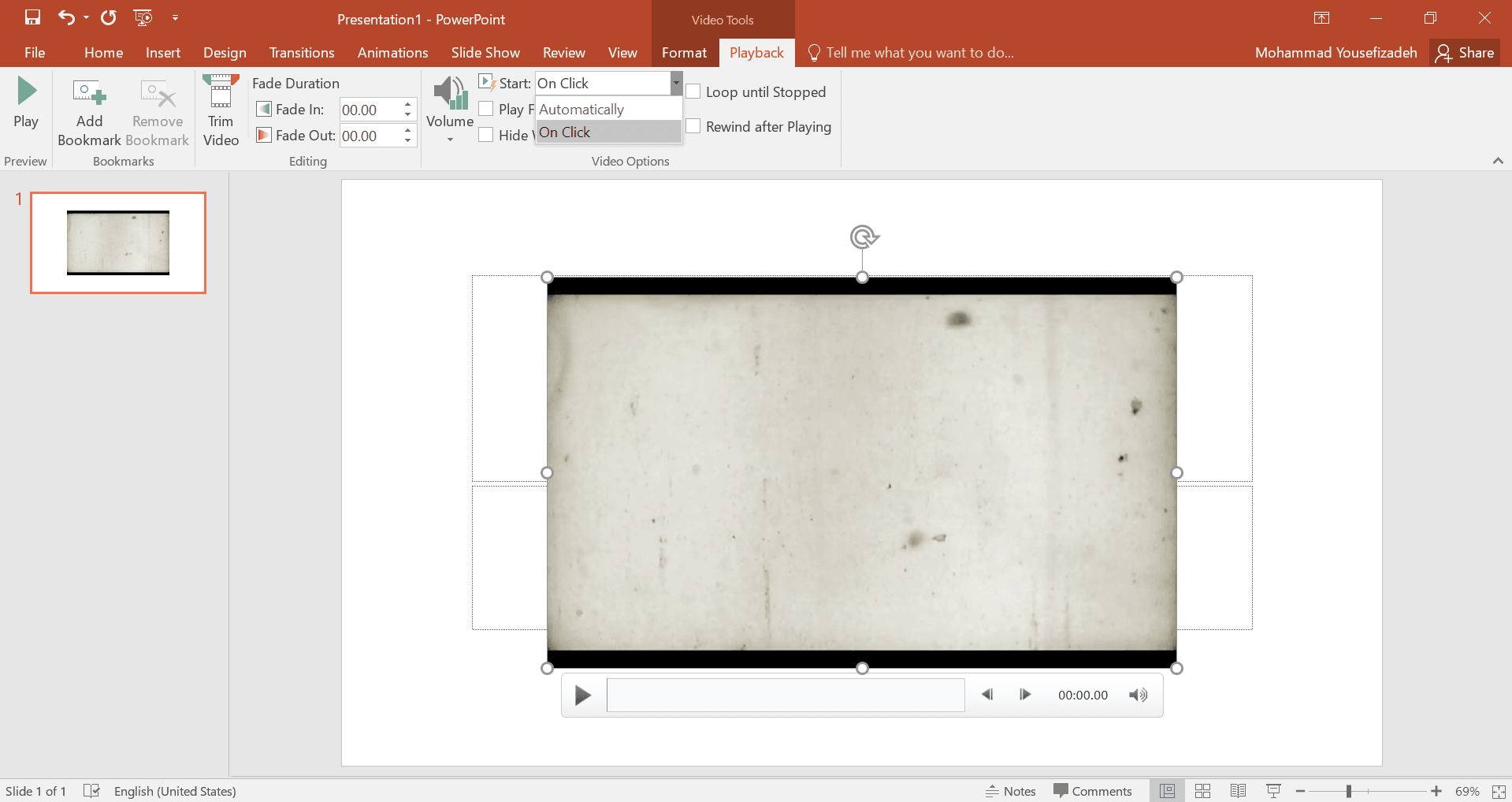 پس از این کار از تب video tools که در اختیار شما قرار می گیرد مشخص کنید که آیا قصد دارید ویدیو بلافاصله پس از بارگزاری اسلاید شروع به پخش شدن کند یا پس از کلیک کردن بر روی اسلاید پخش ویدیو آغاز شود. برای انجام این تنظیمات در تب جدید video tools بر روی playback کلیک کنید و بعد در نوار پایینی روبروی عبارت start بین دو گزینه on click (پخش بعد از کلیک کردن روی اسلاید) و automatically (پخش خودکار) یکی را انتخاب کنید.